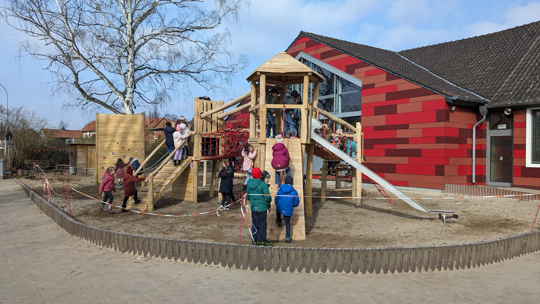 Nach einer langen Zeit des Wartens haben wir seit Anfang 2024 das lang ersehnte große Klettergerüst. Es hat alle Komponenten, die die Kinder sich gewünscht haben. Es gibt verschiedene Rutschen, Boulderwände, Wackel- und Kriechtunnel, verschiedene Balancierbalken und diverse Klettermöglichkeiten.